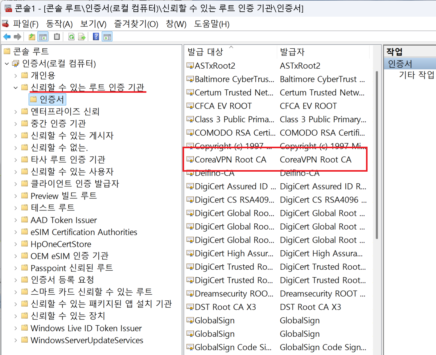 ¾Æ·¡ "[2] ÀÎÁõ¼ ¼öµ¿ ¼³Ä¡" ¿¡¼ 1 ~ 6 ¹ø ±îÁö ½ÇÇàÇØ¼ CoreaVPN ÀÎÁõ¼°¡ ³ª¿À´ÂÁö È®ÀÎÇϽʽÿÀ.